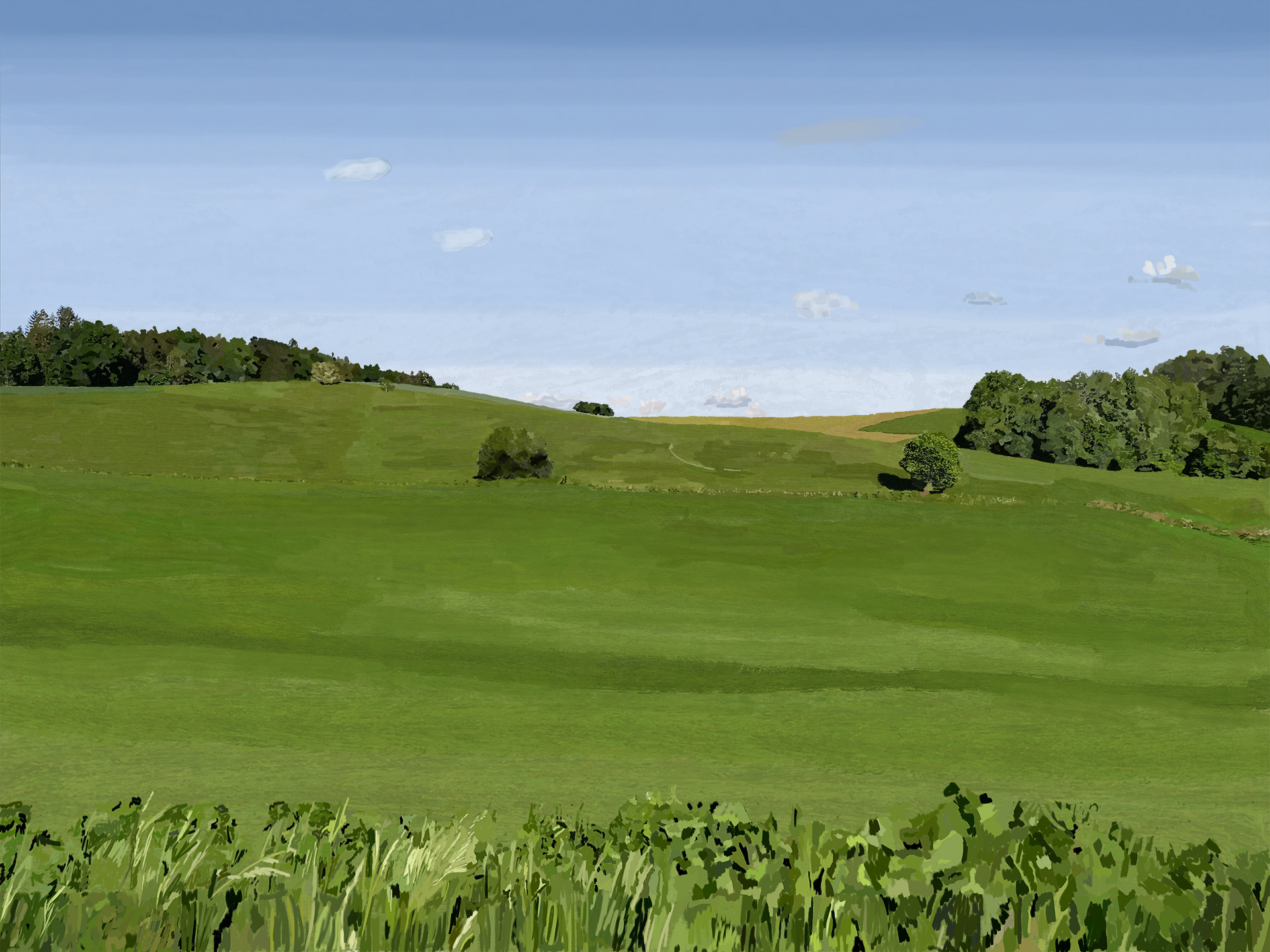 This scenery looks like a windows screen - a peaceful place in the middle of nature. But these gentle hills doesn't exist anymore. The Farmer sold the land to dig for sand and gravel. Digital Painting Animation; 2880 x 2160 px